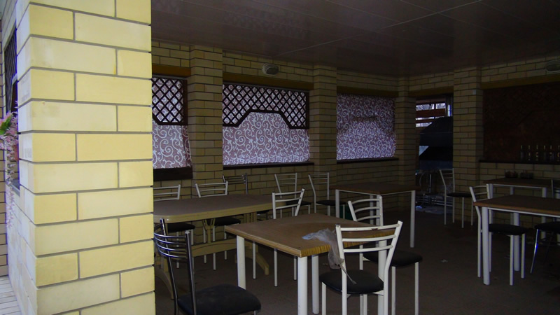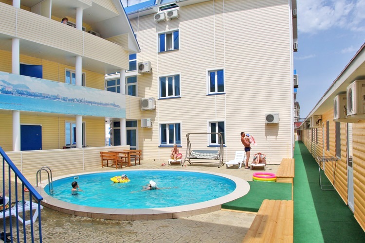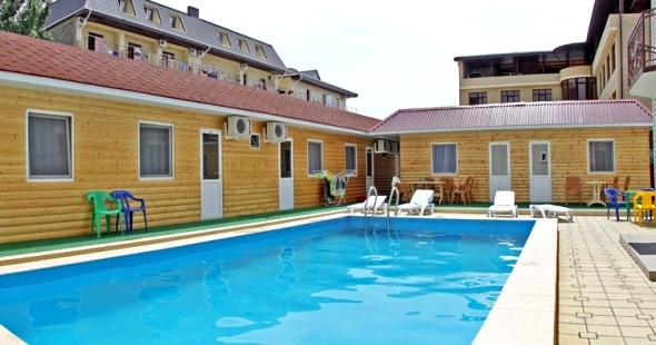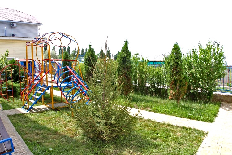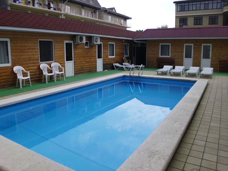 Инфраструктура: на благоустроенной территории бар, столовая, детская площадка, беседки, три бассейна и две зеленые зоны места для парковки автомобилей.