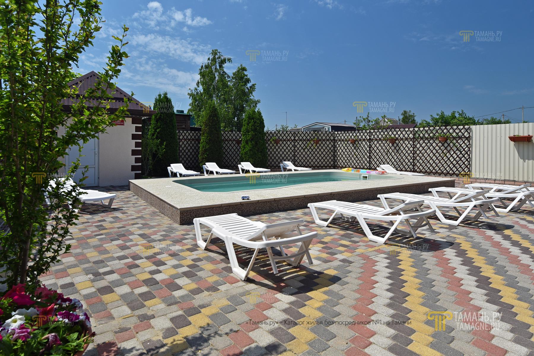 Инфраструктура: Для отдыха и трапезы на свежем воздухе также есть большой навес со столиками и стульями, бар, мангал. На территории детская площадка. Гости могут воспользоваться бассейном с подсветкой и подогревом, где, благодаря новейшей системе фильтрации воды, уровень содержания хлора близок к нулю.