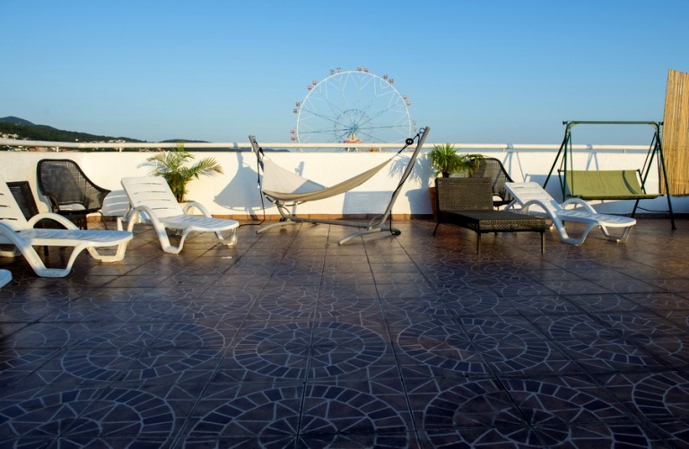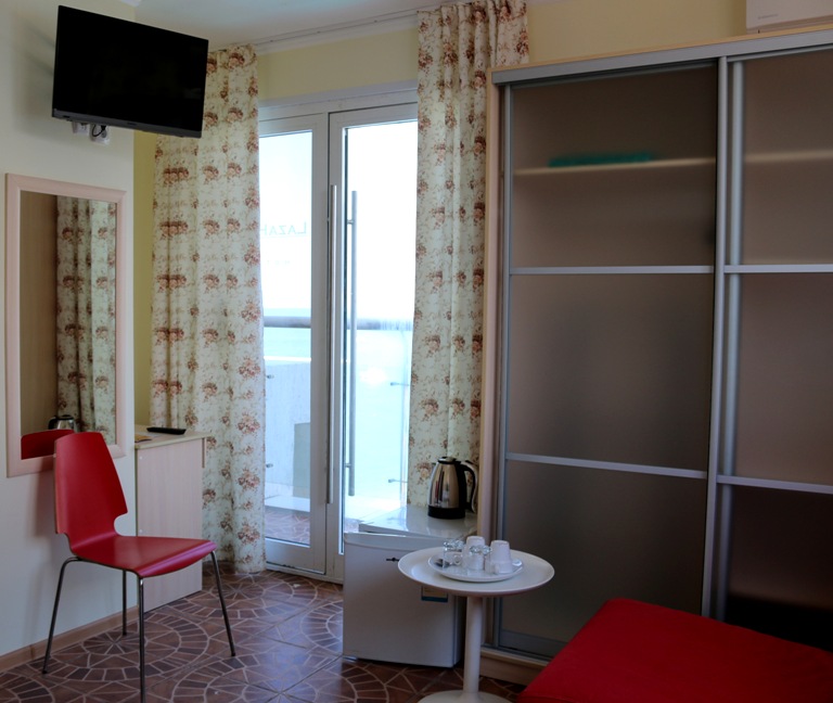 - 2-х местный стандартный номер. В номере двуспальная кровать, шкаф, тумбочки, пуфики, стол с зеркалом, телевизор, холодильник, кондиционер, электрический чайник, комплект белья и полотенец, набор посуды на два человека (чашки, ложки, тарелки), необходимые средства гигиены (туалетная бумага, мыло, освежитель воздуха), пол – плитка. Дополнительное место – евро раскладушка или кресло-кровать Икеа. Номера расположены на 7-ом этаже рядом с бассейном, с балконами и боковым видом на море.