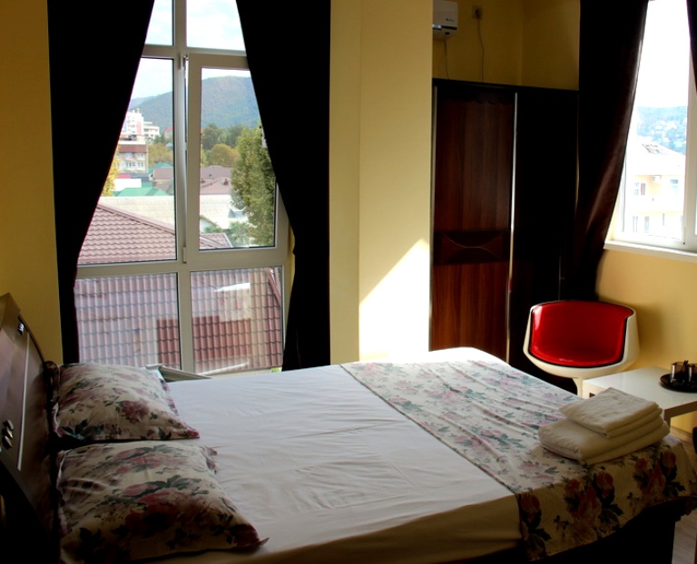 - 2-х местный стандартный номер. В номере двуспальная кровать, шкаф, тумбочки, пуфики, стол с зеркалом, телевизор, холодильник, кондиционер, электрический чайник, комплект белья и полотенец, набор посуды на два человека (чашки, ложки, тарелки), необходимые средства гигиены (туалетная бумага, мыло, освежитель воздуха), пол – ламинат. Дополнительное место – евро раскладушка или кресло-кровать Икеа. Номера расположены на 2-ом-5-ом этажах без балконов, с видом на поселок, горы или соседнюю гостиницу.