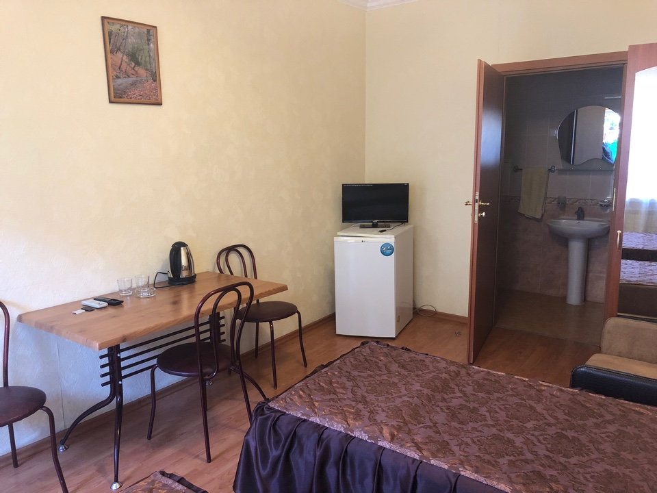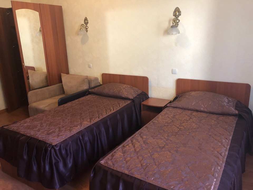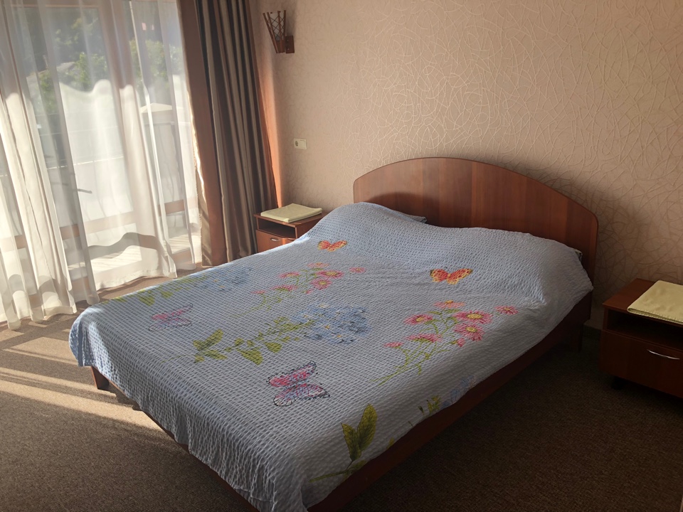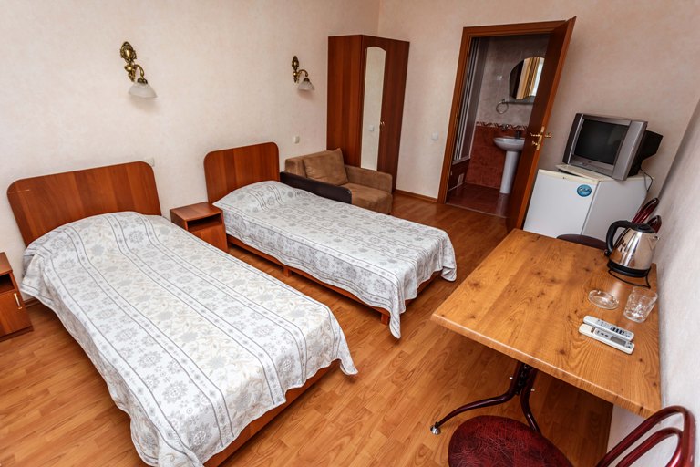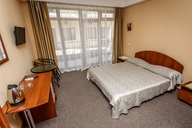 – 2-х местный стандартный номер с удобствами. В номере: одна двуспальная или две раздельные кровати, шкаф, телевизор, холодильник, чайник, кондиционер, туалет, умывальник, душ. Дополнительное место предоставляется независимо от возраста – кресло кровать. Все номера с выходом на общий балкон.