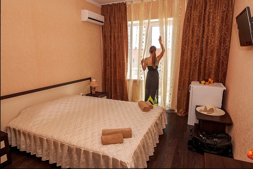 – 2-х местный стандартный номер с удобствами. В номере либо большая двуспальная кровать, либо две односпальные, зеркало, шкаф, прикроватные тумбочки, журнальный столик, туалетный столик. Дополнительное место раскладывающийся диванчик или еврораскладушка. В номерах установлены встроенный мини-сейф, телевизор, холодильник и кондиционер. Санузел: раковина, душевая кабина, унитаз.