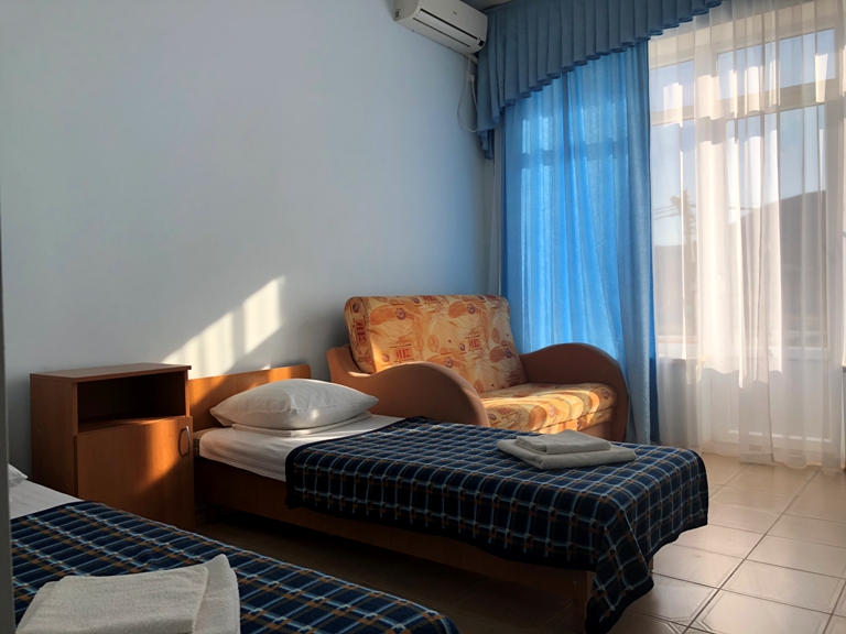 –2-3-4-х местный «улучшенный» номер без балкона. В номере: двуспальная кровать и раскладной диван, холодильник, спутниковое телевидение, кондиционер, мини-бар, минимальный набор посуды. Санузел: душ, туалет, умывальник.